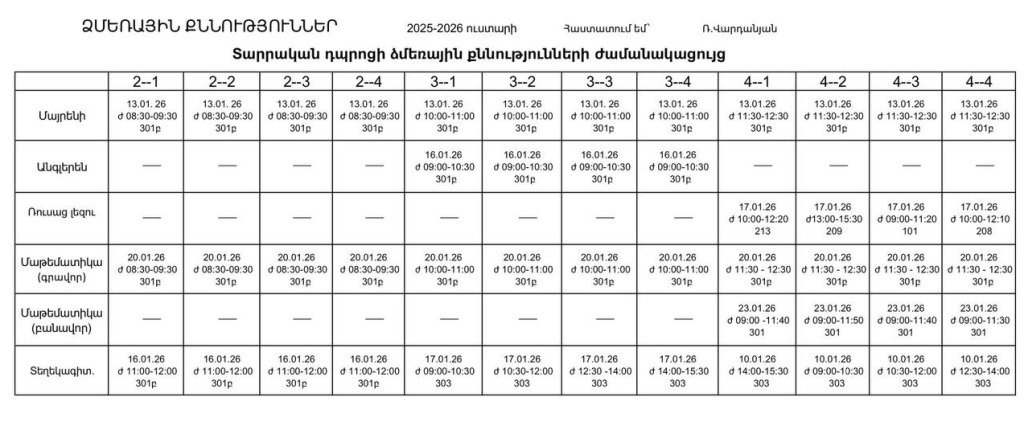 Սիրելի աշակերտներ տեղադրված է ձմեռային քննությունների ժամանակացույցը։ Քննությունների ժամանակացույց 5-12-րդ դասարաններ