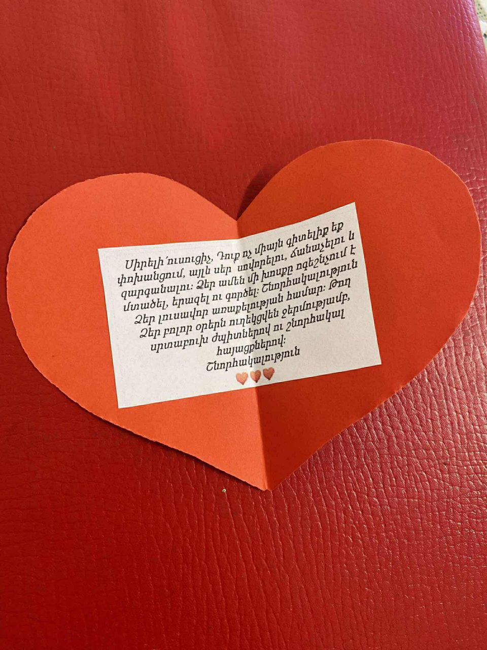 Քվանտական սիրո փոքրիկ սուրհանդակները, դասասենյակների դռների ետևում հանկարծակի հայտնվելով, ուսուցիչներին փոխանցում էին ոչ միայն բացիկներ, այլև սրտիկների լեզվով՝ անմիջական ջերմություն, երախտագիտություն ու մանկական պարզ սեր, իրենց փոքրիկ ձեռքերի մեծ երախտագիտությունը։ Բացիկների վրա գրված էին իրենց բառերով ձևակերպած մաղթանքներ, որոնք անշուշտ հուզեցին ուսուցիչներից շատերին․ «Շնորհակալություն Ձեր լուսավոր առաքելության համար», «Դուք ոչ միայն գիտելիք եք փոխանցում, այլև սեր․․․»․․․